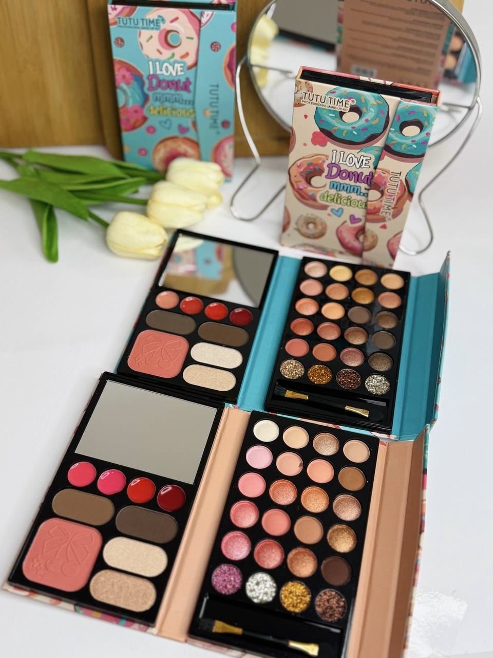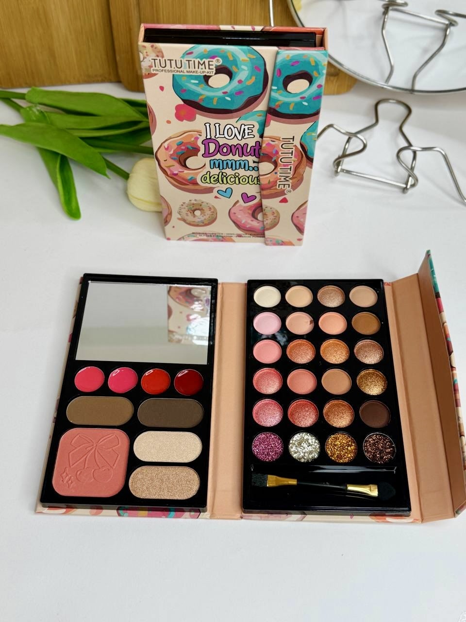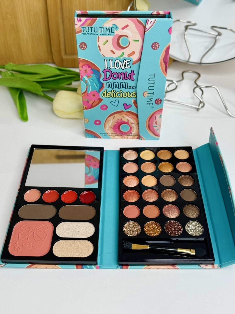 پالت آرایشی حرفهای TUTU TIME مدل I Love Donut! Mmm… delicious! با طراحی شیرین و دوستداشتنی دونات، مجموعهای کامل برای آرایش چشم و صورت است.